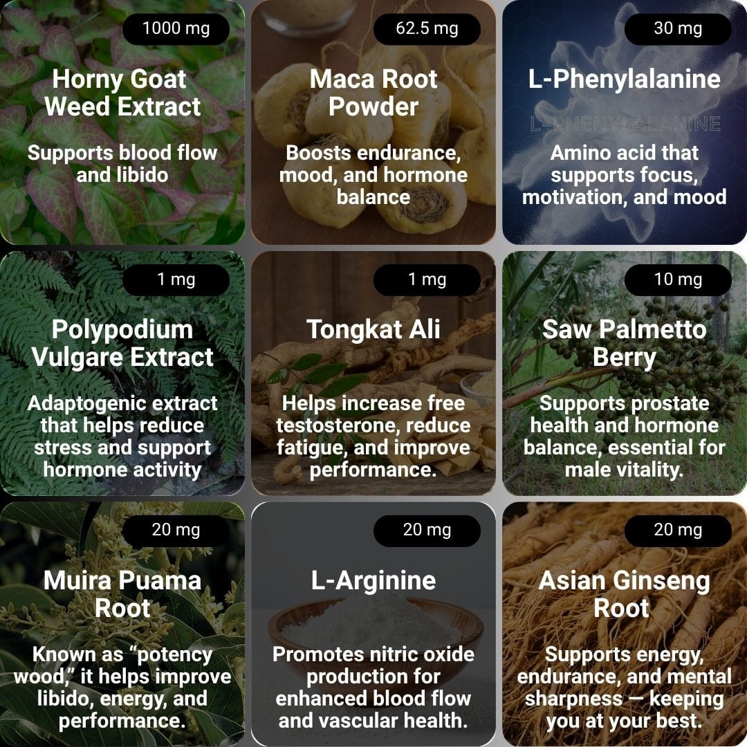 This powerful blend combines time-tested herbs and key amino acids to naturally elevate testosterone, boost stamina, and enhance overall performance — helping you look, feel, and perform at your best every day.